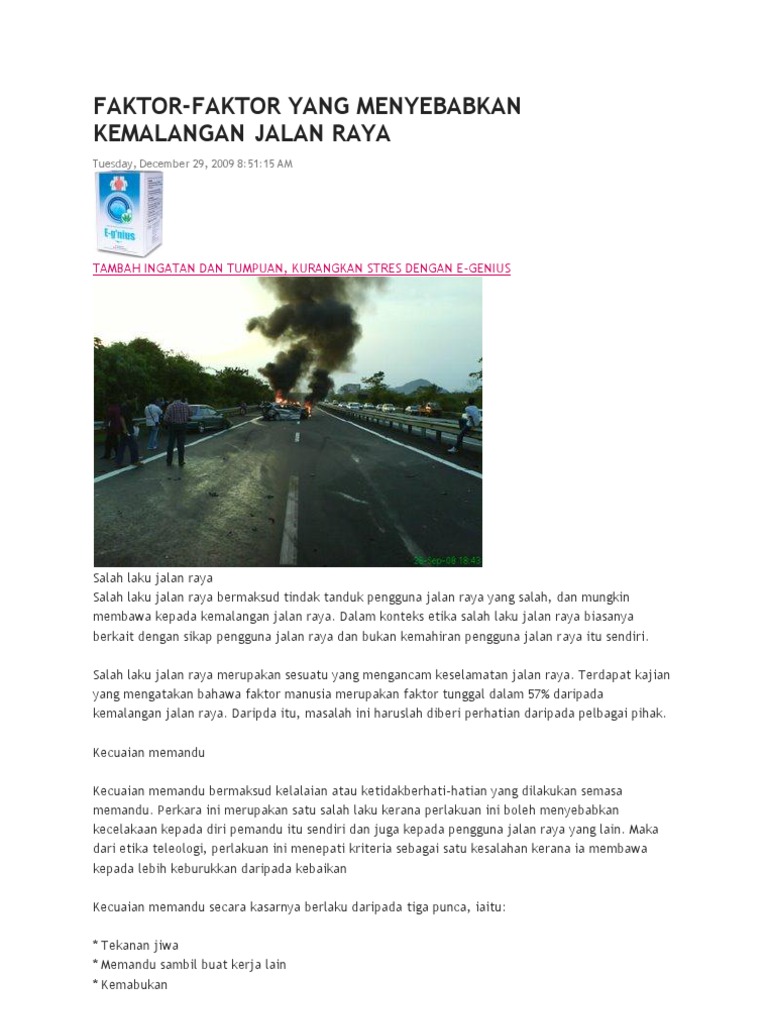 Kemalangan tersebut menyebabkan kecederaan ringan kecederaan parah dan kematian. Oleh itu semua pihak hendaklah bekerjasama untuk mengatasi kemalangan jalan raya. 21012013 Kesimpulannya pengguna yang cuai boleh menyebabkan kemalangan jalan raya di negara kita.