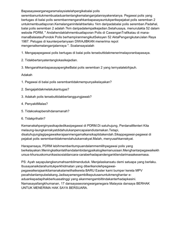 Dalam kes ini kejadian jauh dari Balai Polis Trafik. 16072018 Jika anda pernah kemalangan jalanraya yang ringan antara perkara yang dianggap paling leceh adalah perlunya ke balai polis trafik untuk membuat laporan. Kebiasaannye kenderaan awam tak dibenokan di balai maka silalah kabo kepada anggota polis di pondok.