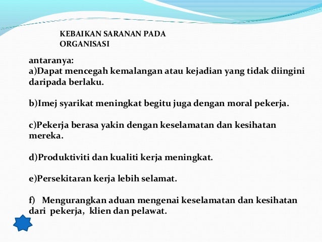Tanpa kita sedari sebenarnya kita lebih berisiko untuk mendapat kemalangan di tempat kerja berbanding dengan kemalangan jalan raya. Kemalangan yang berlaku di tempat kerja bukan sahaja boleh menyebabkan terganggunya daya pengeluaran malah membabitkan waris mangsa yang menghadapi kehilangan sumber pendapatan. 38819782 Kemalangan Di Tempat Kerja Ppt.