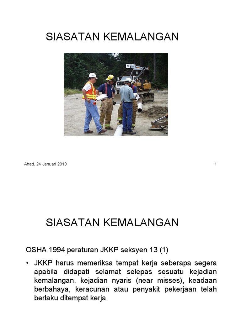 Langkah kawalanjangka pendek. 03082019 Siasatan kemalangan tempat kerja industri memberi tumpuan terhadap proses mengenalpasti mengekang dan membetulkan sebab-sebab utama kemalangan. 24032021 Semua tempat kerja perlu mematuhi segala peraturan ditetapkan Akta Keselamatan Dan Kesihatan Pekerja AKKP.